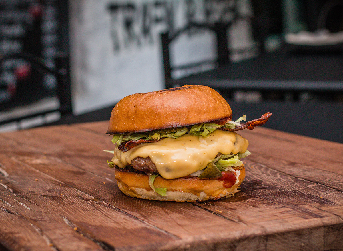 Bacon, BBQ szósz, BUCI, Cheddar Sajt, Csemegeuborka , HÚSpogácsa, Jégsaláta