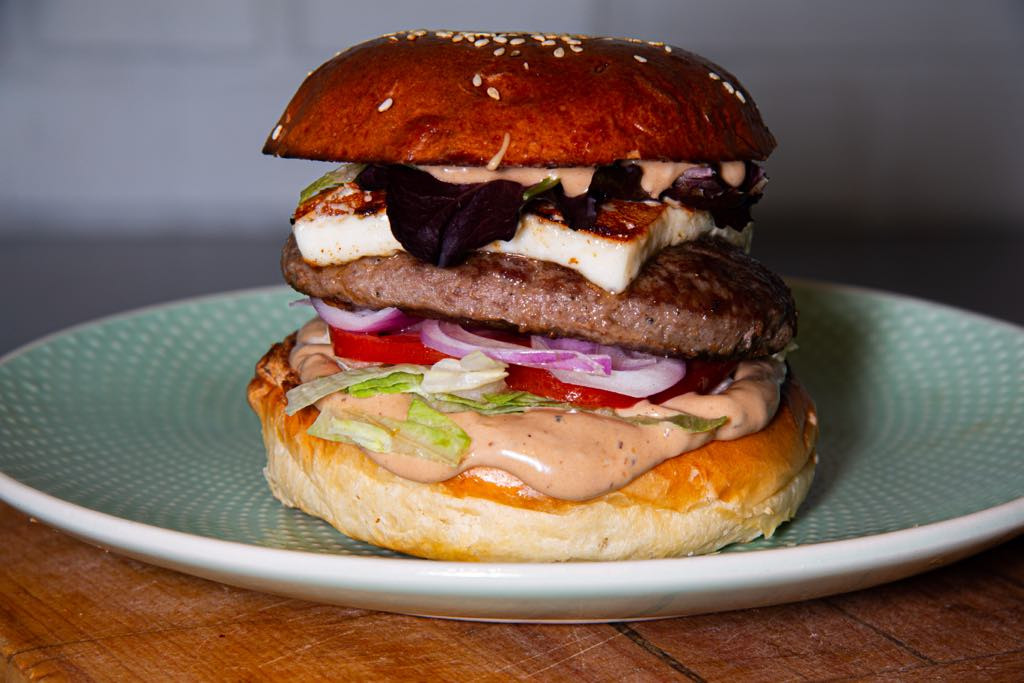 BUCI, Fokhagymás majonézes szósz, HÚSpogácsa, Jégsaláta, Kecskesajt, Lilahagyma, Paradicsom