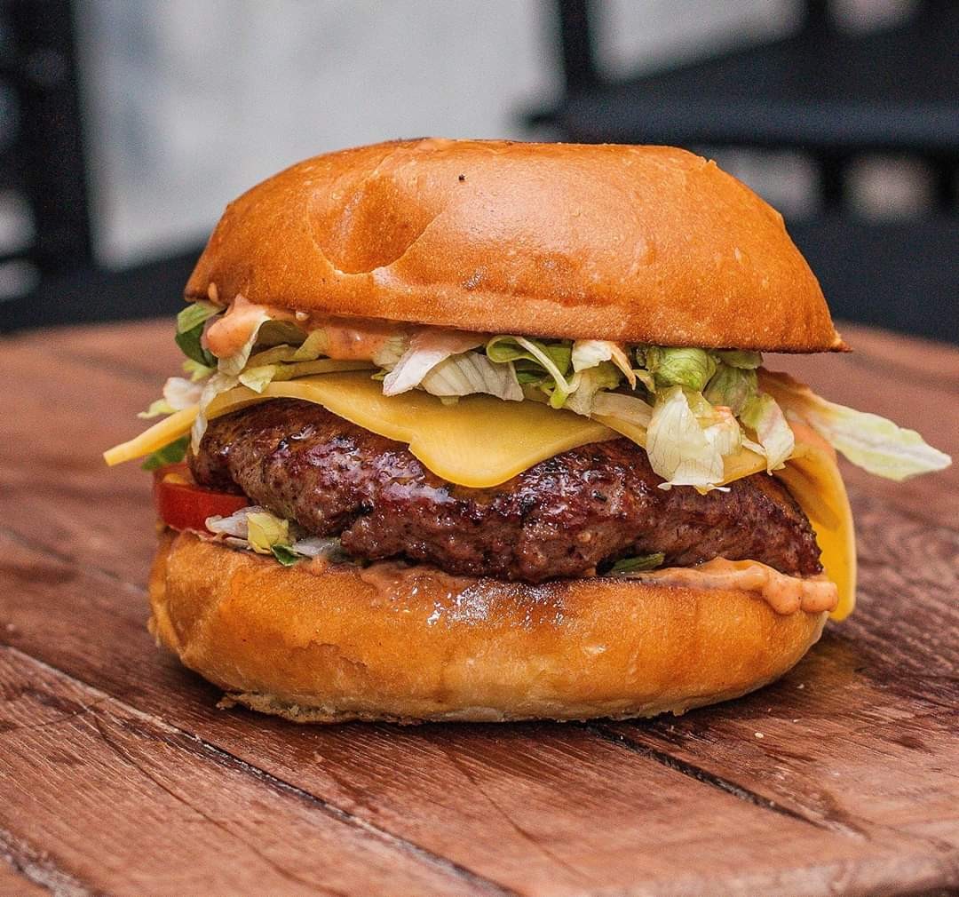 BUCI, Cheddar Sajt, Házi szósz , HÚSpogácsa, Jégsaláta, Paradicsom