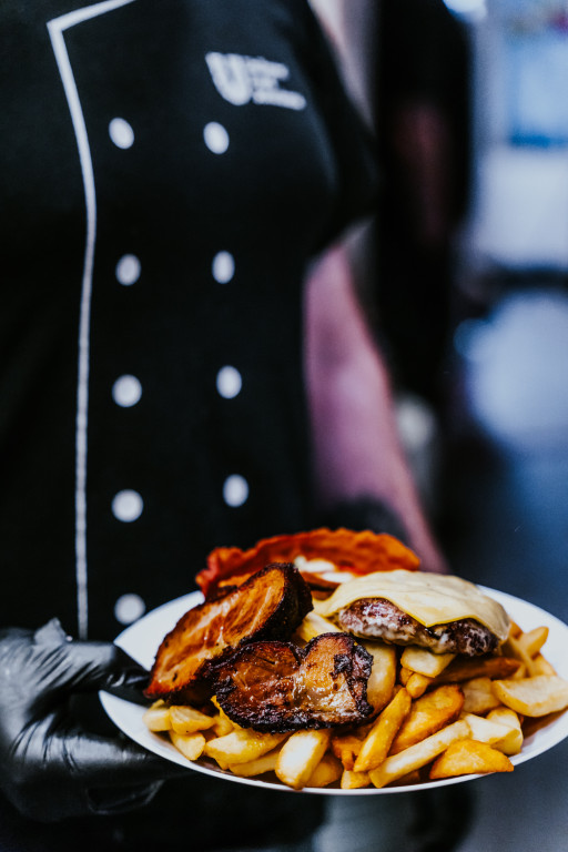 BBQ szósz, Fokhagymás majonézes szósz, Füstölt sajt , HÚSpogácsa, Jégsaláta, Paradicsom, Smoker Tarja, Sültkrumpli