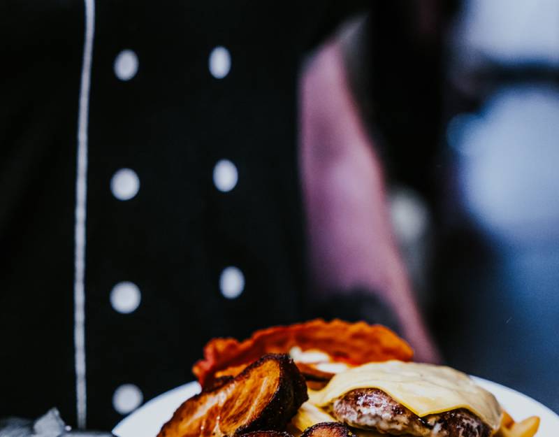BBQ szósz, Fokhagymás majonézes szósz, Füstölt sajt , HÚSpogácsa, Jégsaláta, Paradicsom, Smoker Tarja, Sültkrumpli